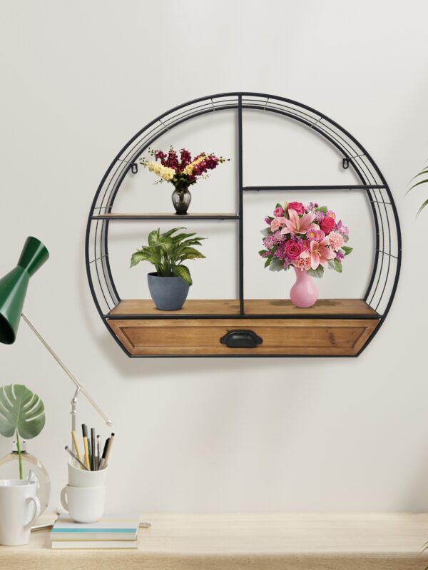 Stunning circular wall shelf with 4 shelves and one drawer. Each shelf has a limit of 4 lbs; Rusty finish iron frame, solid wood shelves and wood drawer.