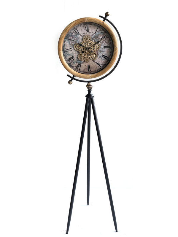 This elegant tripod floor clock features a globe-inspired frame, warm antique-gold dial, and intricate decorative gears for a refined vintage-industrial look. Supported by a slim black metal tripod stand, it serves as a striking statement piece for living rooms, offices, studios, or entryway corners.