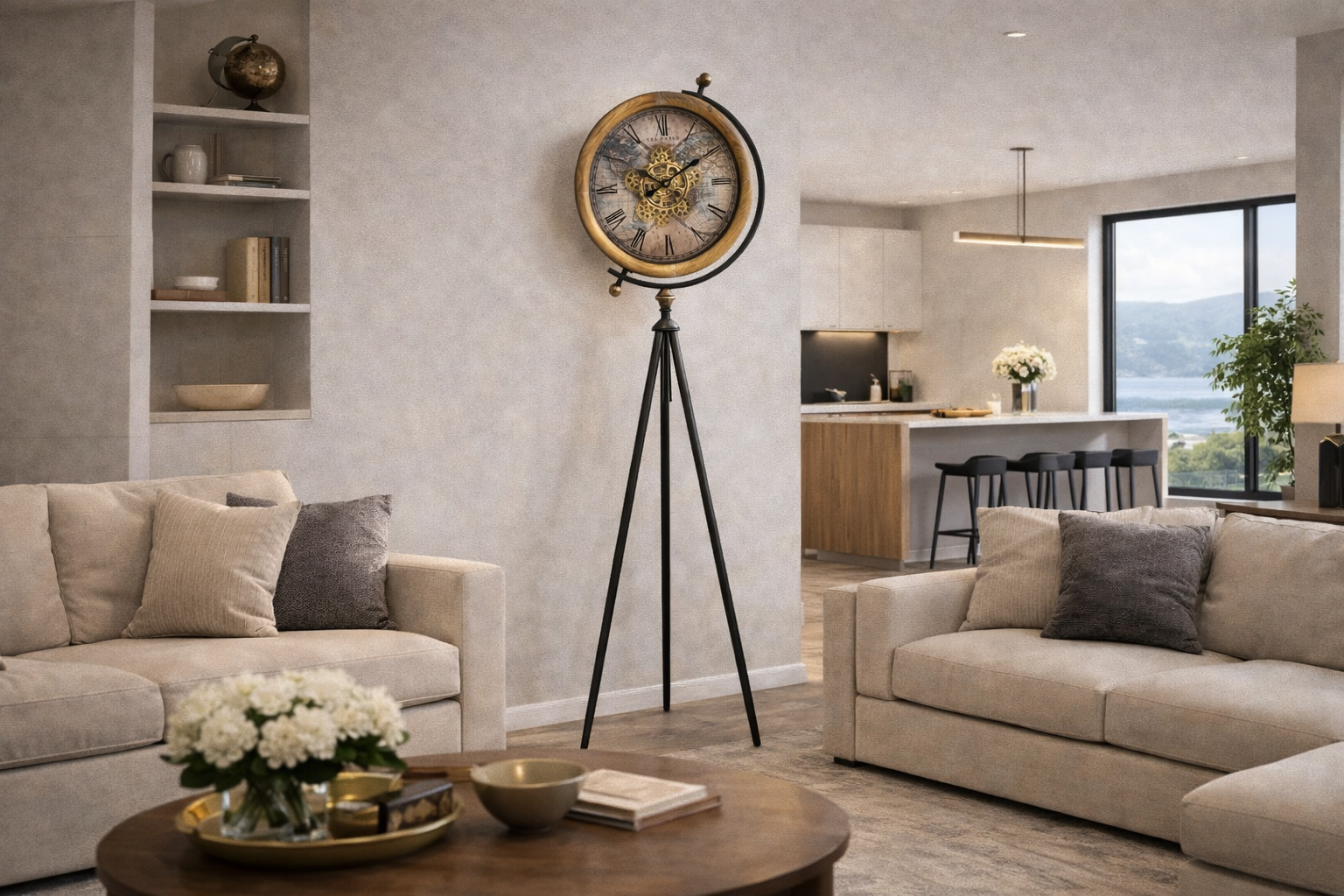 Bring character, height, and old-world charm into your home with the Atlas Tripod Gear Floor Clock, a beautifully crafted standing timepiece that blends globe-inspired design with industrial mechanical detailing. Standing tall on a sleek black metal tripod, this clock transforms any room into a curated, gallery-style space.