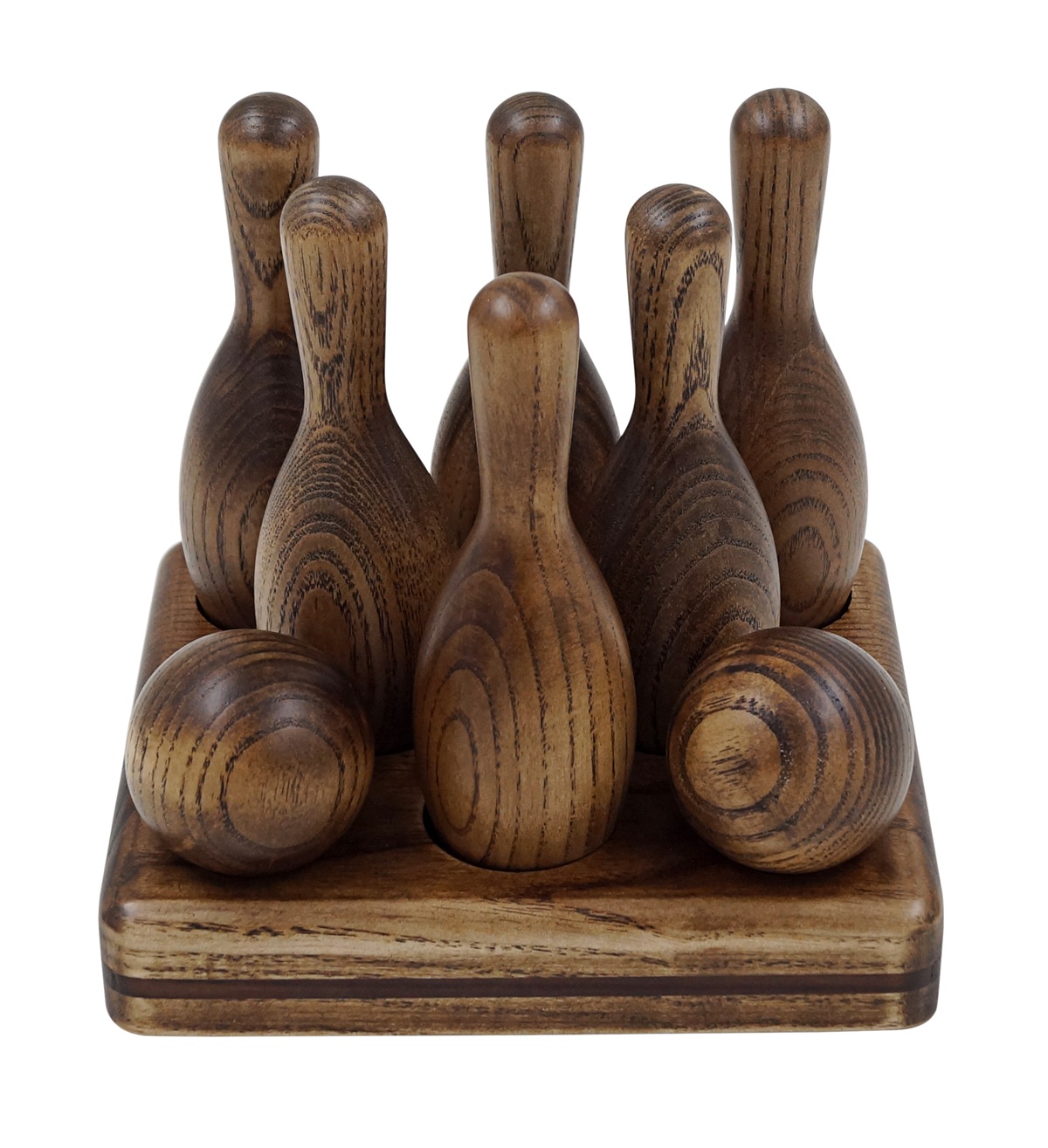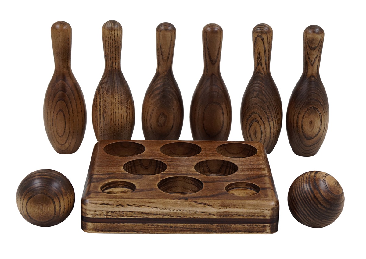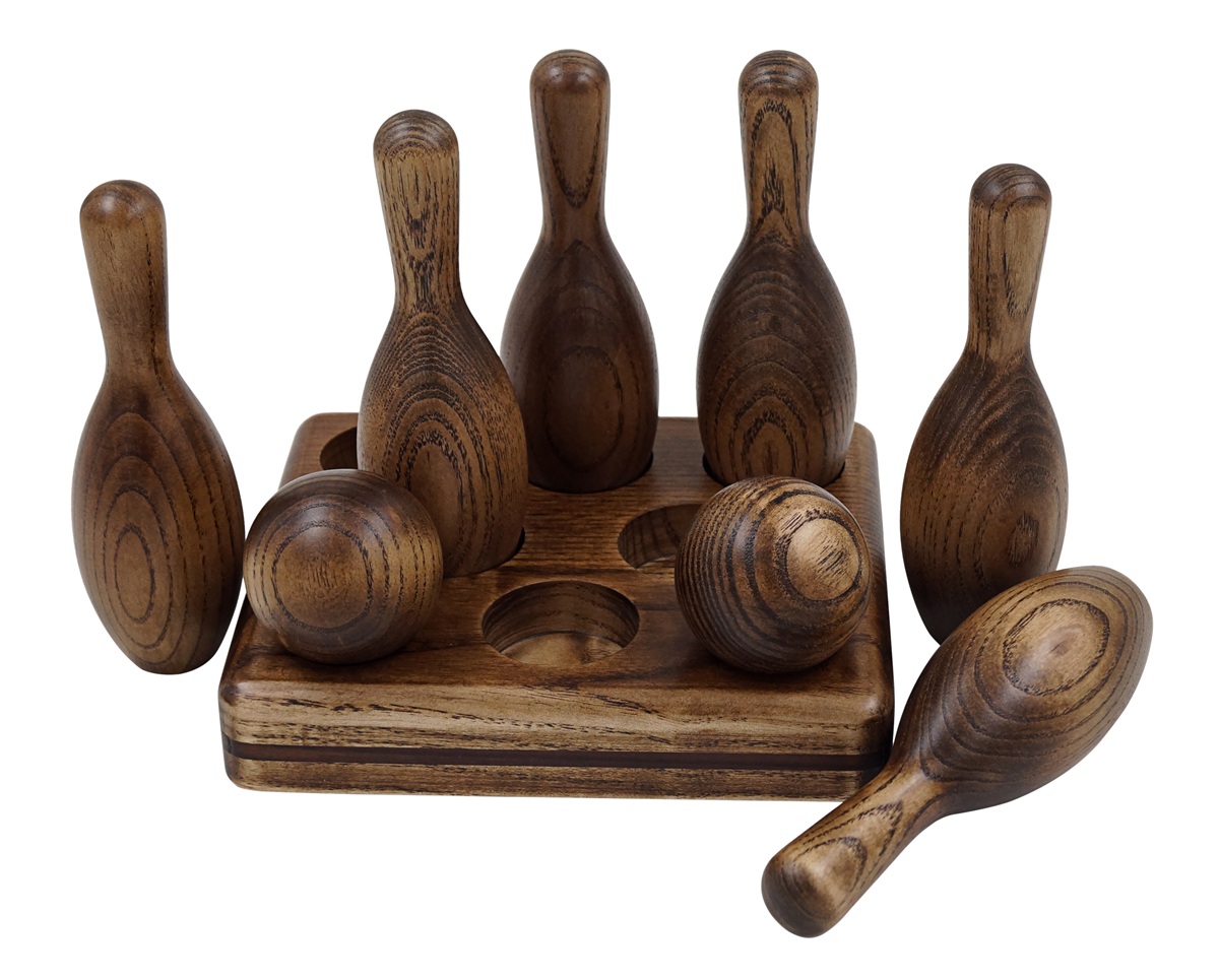 Each bowling pin and ball is meticulously hand-carved, ensuring symmetry and precision.