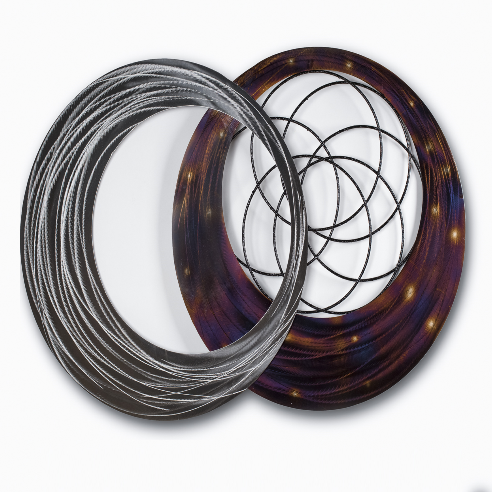 Original Wall Art in Metal. Duo Circles in a Handcrafted piece. Silver and Brass Tones – one of a kind. Sander polish to silver color and fire burnt brown colour.