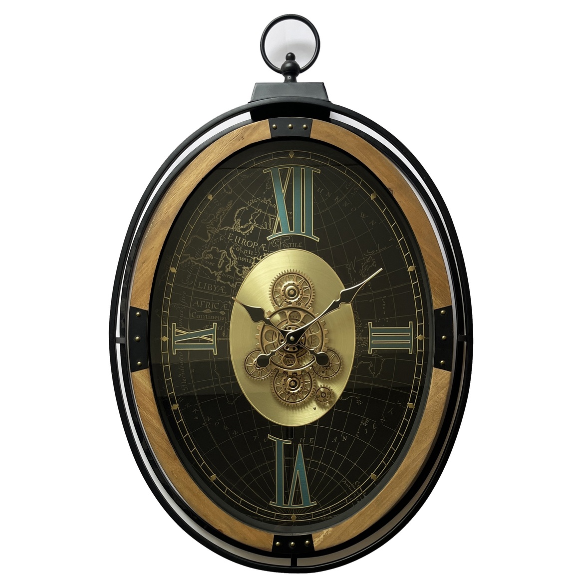 The tall oval frame pairs a sleek black metal exterior with warm wood-grain accents, creating a striking contrast that complements both traditional and modern interiors. Large Roman numerals—finished in an antique teal-gold tone—provide bold readability while enhancing the clock’s old-world character. The pocket-watch style top loop adds a final touch of refinement, making this piece both functional and uniquely decorative.