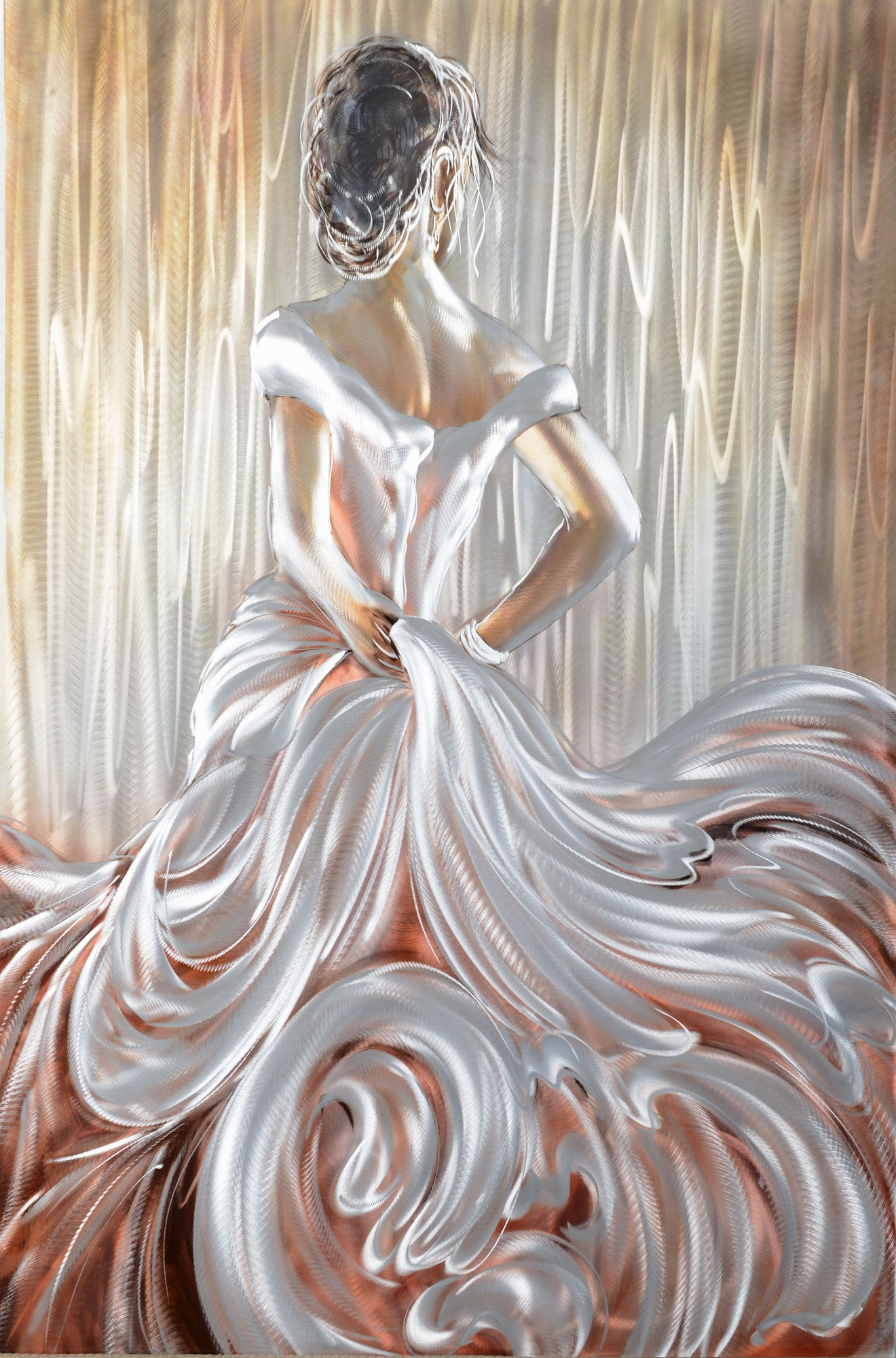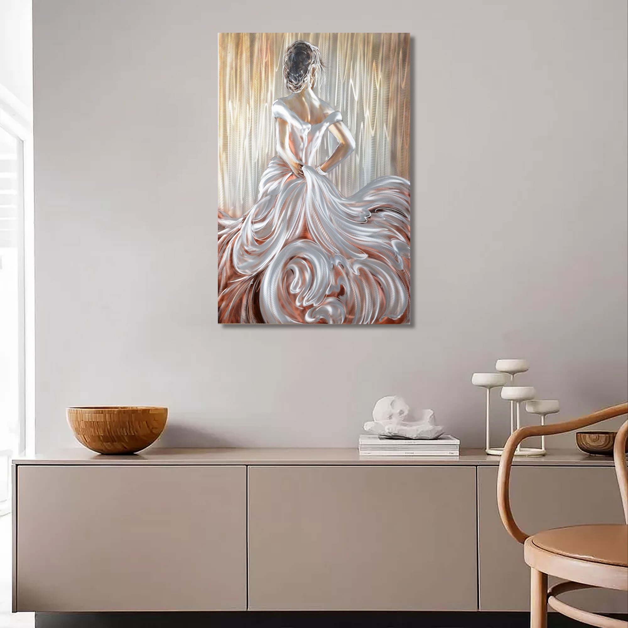 By including this beautiful girl in your house, this decorative aluminium piece of art will be the perfect way to add a flair of beauty to your walls. With a height of 120cm and a width of 80 cm, this girl will be an unforgettable piece of art. Her soft pinkish-peach dress gives a soothing, rich colour, which will enhance the beauty of the picture. Sander Made Art Picture